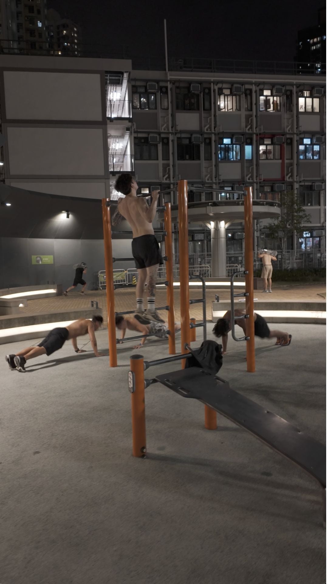 專注於體能訓練,包括引體上升、雙槓撐體